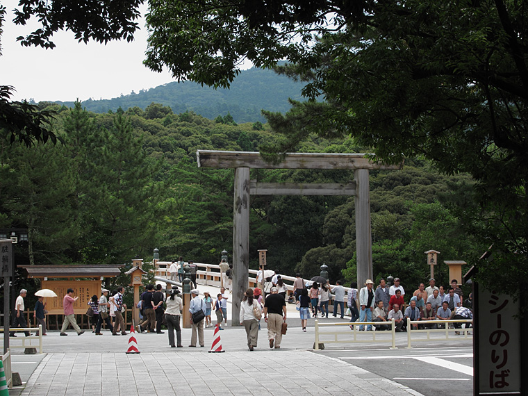内宮の入り口である宇治橋。眼前の道路の左手に、おはらい町が続きます